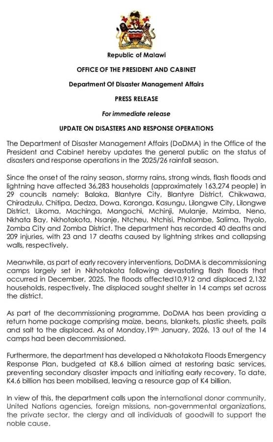Malawi’s Department of Disaster Management Affairs (DoDMA) says more than 36,000 households across 29 local councils have been affected by extreme weather conditions since the onset of the 2025 rainy season.